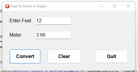 A simple program that I wrote will ask the user to give value in feet and convert into meter equivalent value in Delphi.